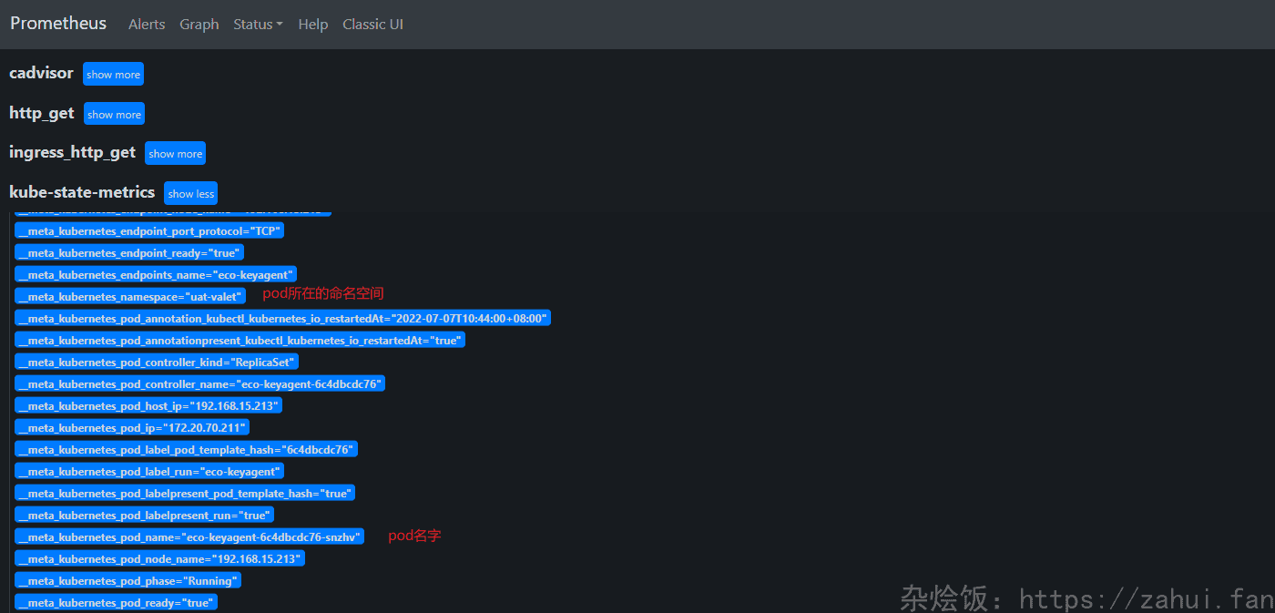 比如上图,监控 k8s 的 pod 状态, 因为 pod 是动态的,所以需要 pod 名字和 pod 的 namespace 信息,就可以从元标签中取值。